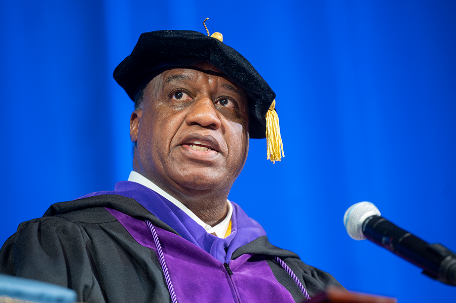The platform party also included personal touches in several prominent figures from Keen’s formative educational background, including his first-grade teacher Jackie Wiggins and his eighth-grade teacher Sandy Woods. Keen’s higher education background was highlighted by Bruce Grube, PhD, president emeritus of Georgia Southern University, who was president when Keen was an undergraduate, and Jere W. Morehead, JD, president of the University of Georgia, where Keen earned his EdD degree. Former AU President Brooks Keel, PhD, also returned to speak on Keen’s behalf, both as a mentor and educator.