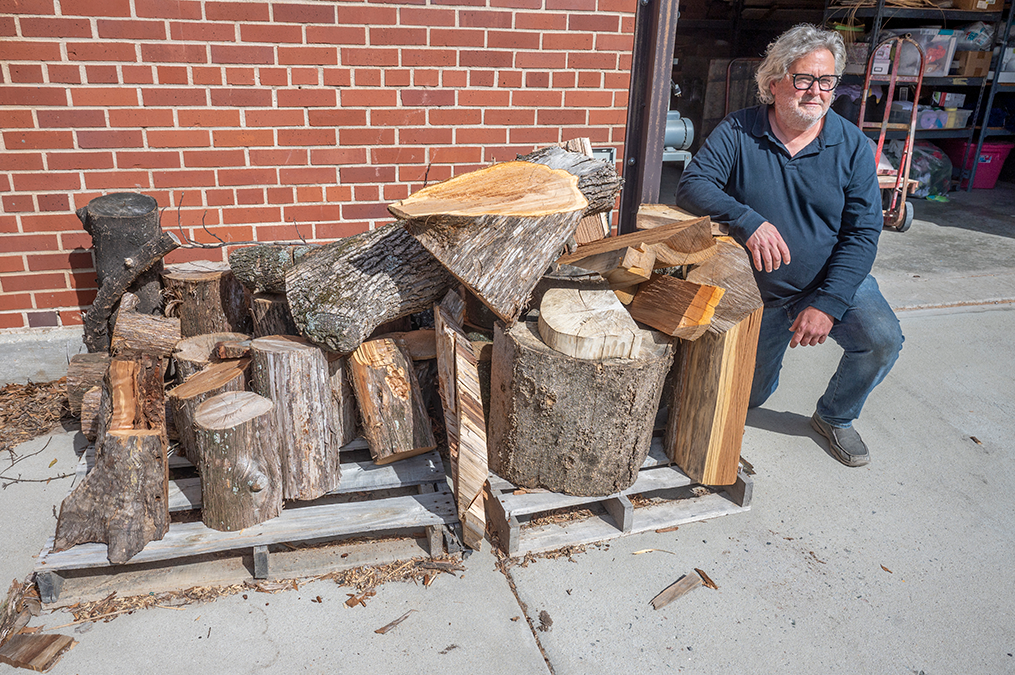 For Brian Rust, an art and sculpture instructor in the Katherine Reese Pamplin College of Arts, Humanities, and Social Sciences, that lemonade was a practical variety. He saw opportunity in the countless downed trees in his neighborhood surrounding the Summerville Campus, knowing his students could use them to practice their craft. About a week into hurricane recovery, as the power and water returned, Rust started collecting big pieces of good carving wood – cedar and magnolia – for students to hone their skills in Carving I, a woodworking course he teaches every spring.